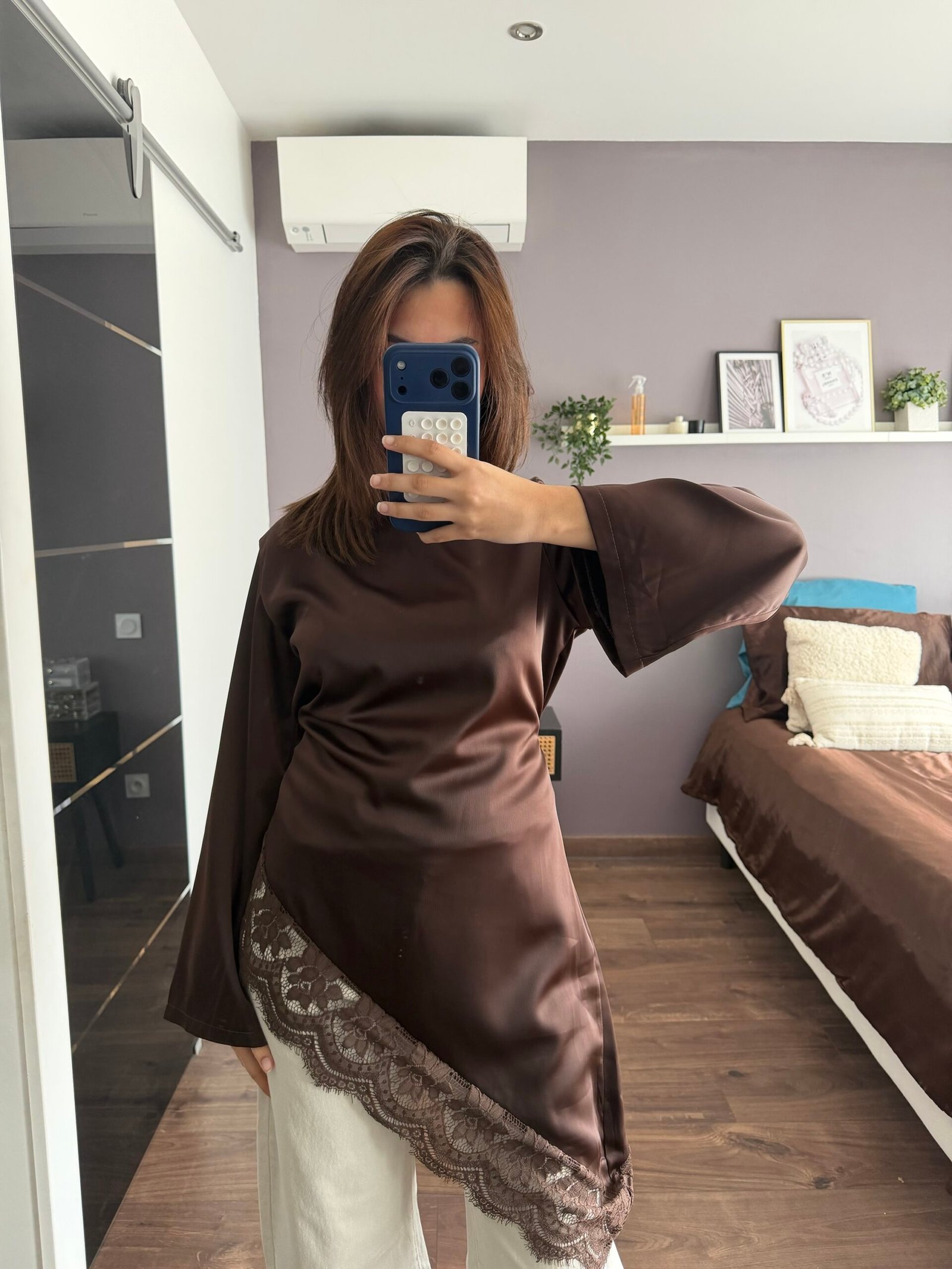 Pull asymétrique dentelle marron satiné à cintrer au niveau du dos