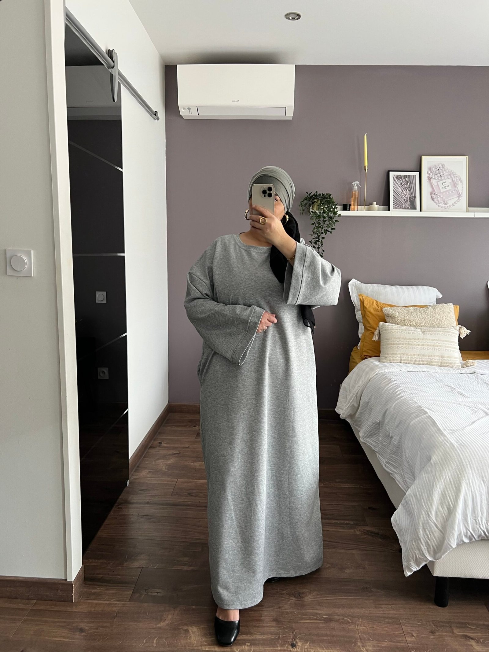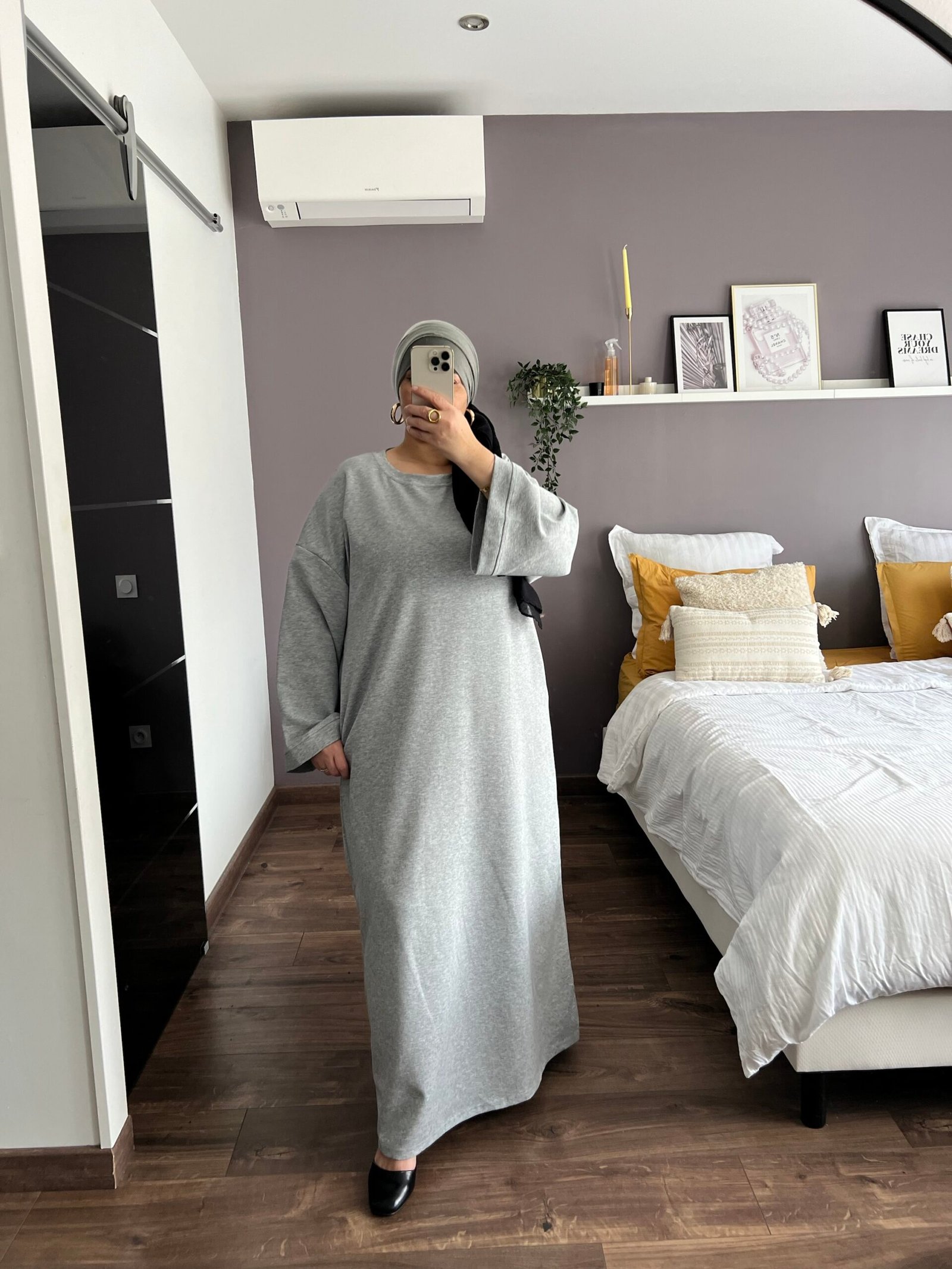 Robe longe Grise en coton, élégante et confortable, avec manches longue. Pour un effet sportwear, on la porte avec des baskets.